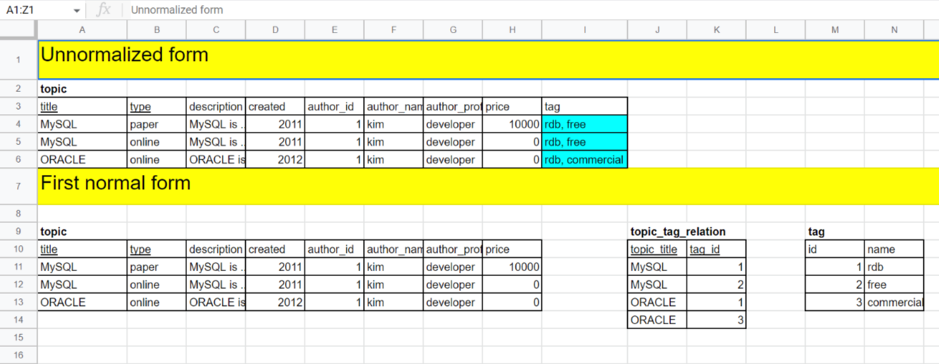 정규화 이전의 표에서 tag는 2개 즉, 유일하지 않은 값을 지니고 있다.